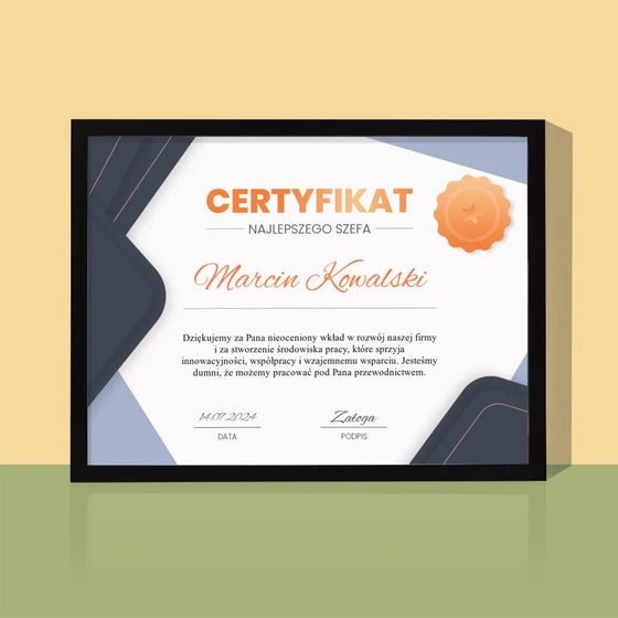 89,99 zł99,99 złCena jednostkowa /NiedostępneImię i Podpis: Certyfikat Najlepszego Szefa - Wydruk obramowany - Poziom