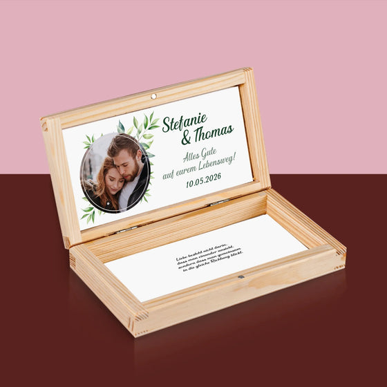 39,99 złCena jednostkowa /NiedostępneZdjęcie i Podpis: Ślubne Listki - Drewniane pudełko na pieniądze