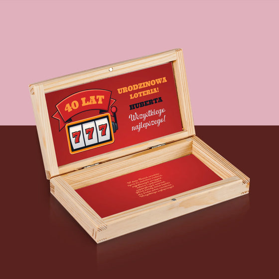39,99 złCena jednostkowa /NiedostępneImię i Podpis: Urodzinowa Loteria Jackpot - Drewniane pudełko na pieniądze