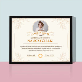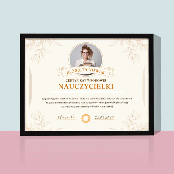 Zdjęcie i Podpis: Certyfikat Wzorowego Nauczyciela - Wydruk obramowany 30x40 - Poziom