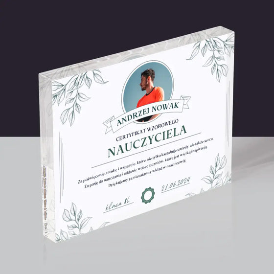 Zdjęcie i Podpis: Certyfikat Najlepszego Wychowawcy - Personalizowany Blok Akrylowy