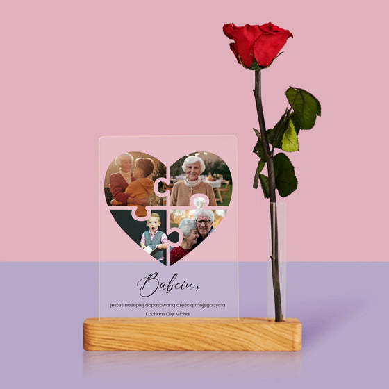 149,99 złCena jednostkowa /NiedostępneFotokolaż: Puzzle Serce Dla Babci - Wydruk na szkle akrylowym z różą