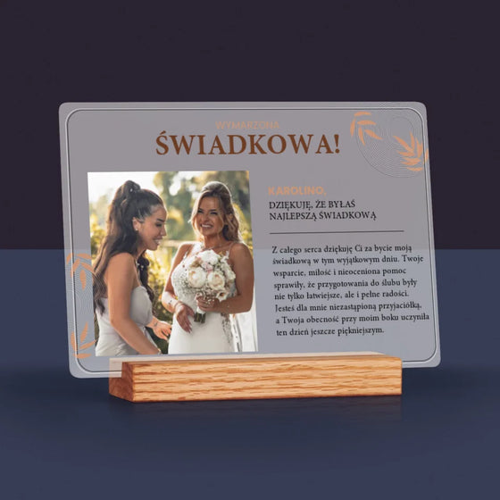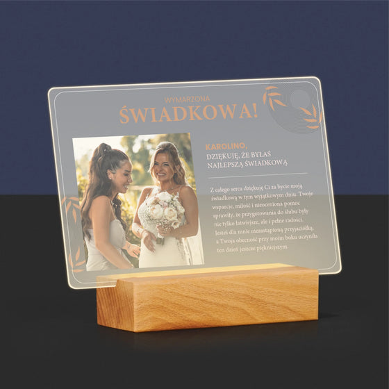 - Zdjęcie i Podpis: Wymarzona Świadkowa - Wydruk na szkle akrylowym LED Poziom 129,99 złCena jednostkowa /Niedostępne