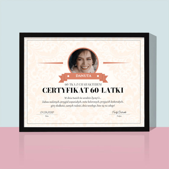- Certyfkat: Certyfikat 60-Latki - Wydruk obramowany - Poziom 99,99 złCena jednostkowa /Niedostępne