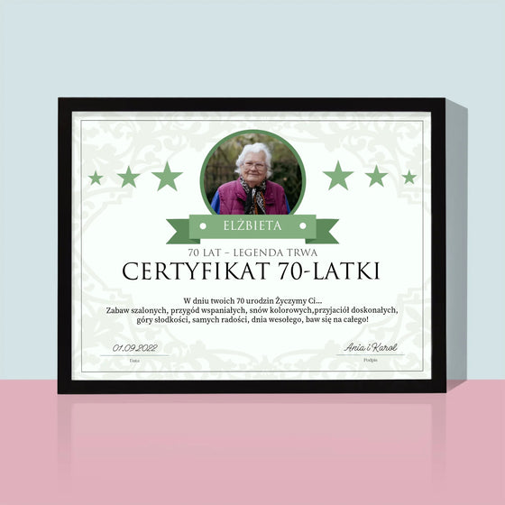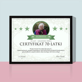 - Certyfkat: Certyfikat 70-Latki - Wydruk obramowany - Poziom 99,99 złCena jednostkowa /Niedostępne