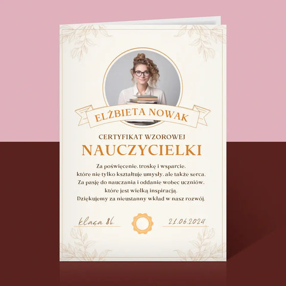 19,99 złCena jednostkowa /NiedostępneZdjęcie i Podpis: Certyfikat Wzorowej Nauczycielki - Kartka z życzeniami