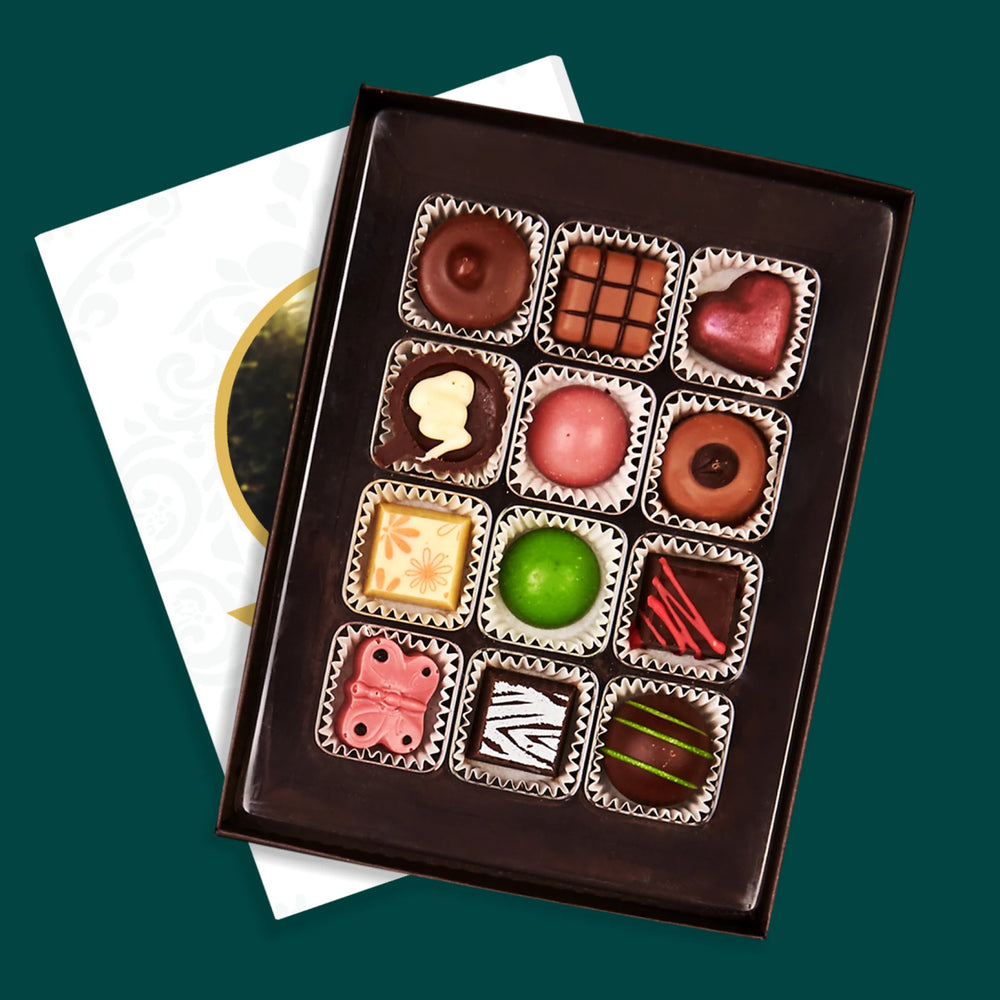 • Pyszne praliny z belgijskiej czekolady w eleganckim pudełku z wybraną przez Ciebie personalizacją.