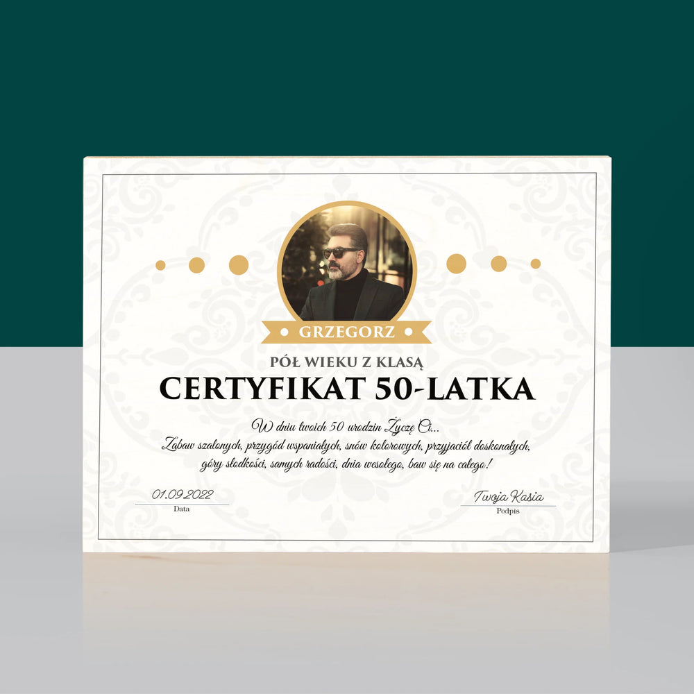 Certyfkat: Certyfikat 50-Latka - Wydruk na drewnie - Poziom