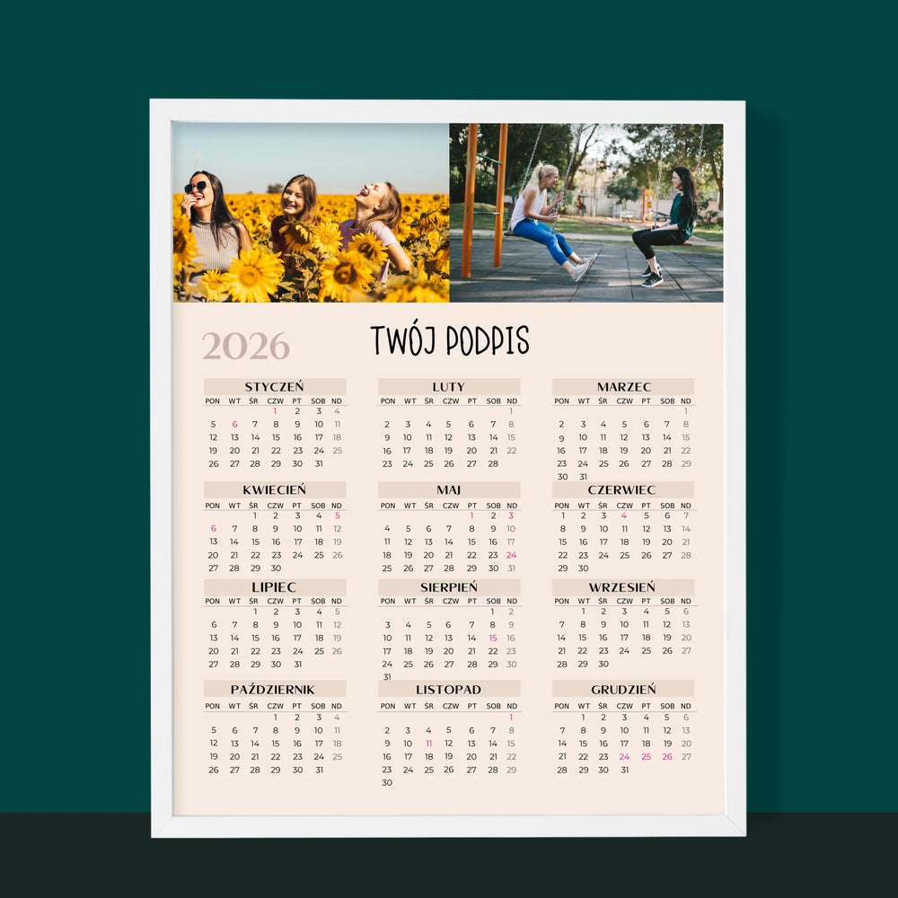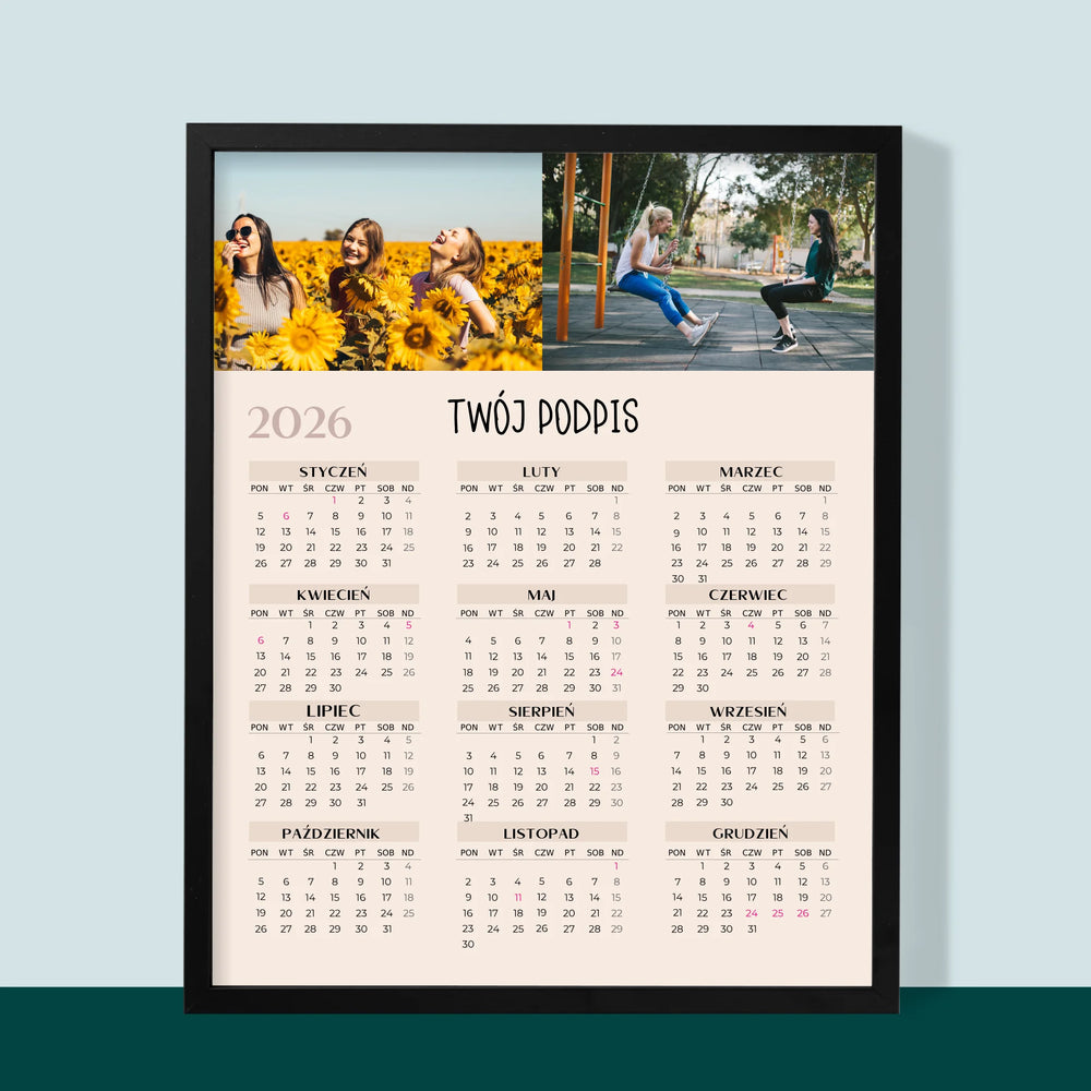 Fotokalendarz oprawiony w ramkę z wybranymi przez Ciebie zdjęciami.