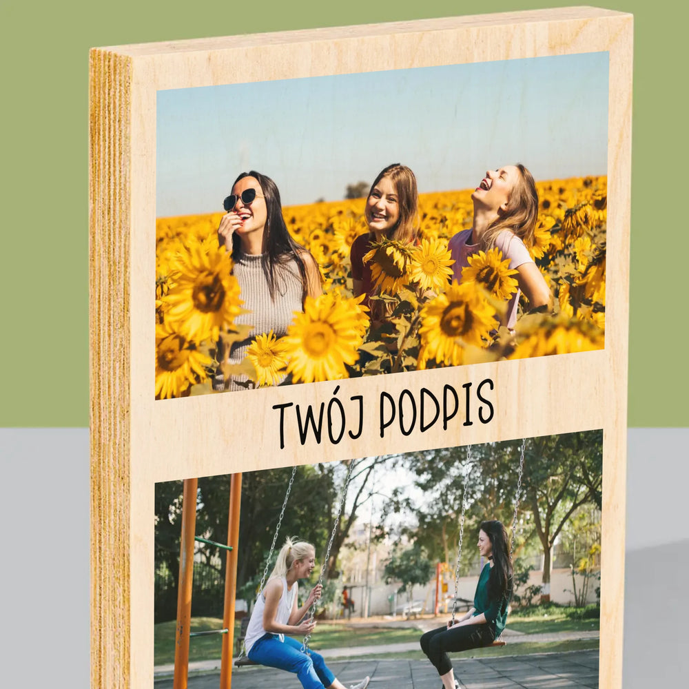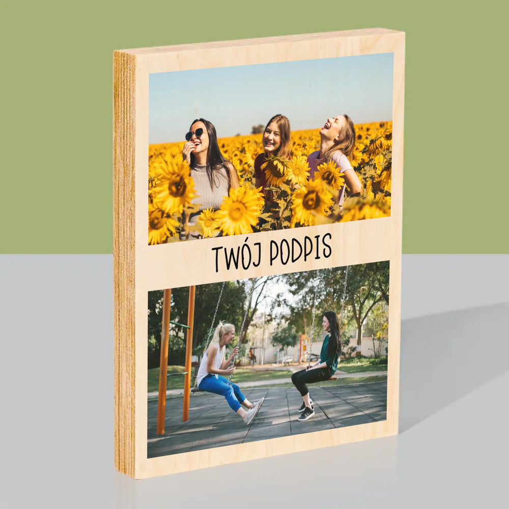 Fotokolaż: 2 Zdjęcia i Podpis - Wydruk na drewnie - Pion