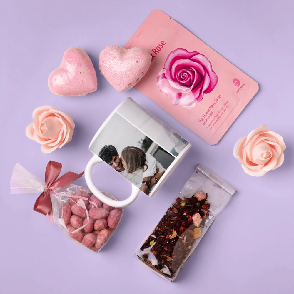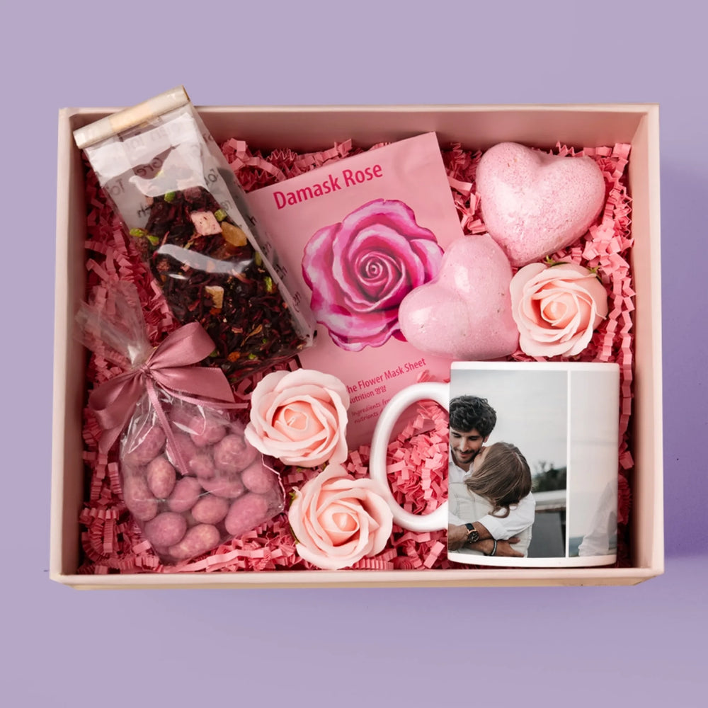 W zestawie znajdują się migdały w czekoladzie, herbata owocowa, maseczka do twarzy w płachcie, kula do kąpieli w kształcie serca oraz róże mydlane.