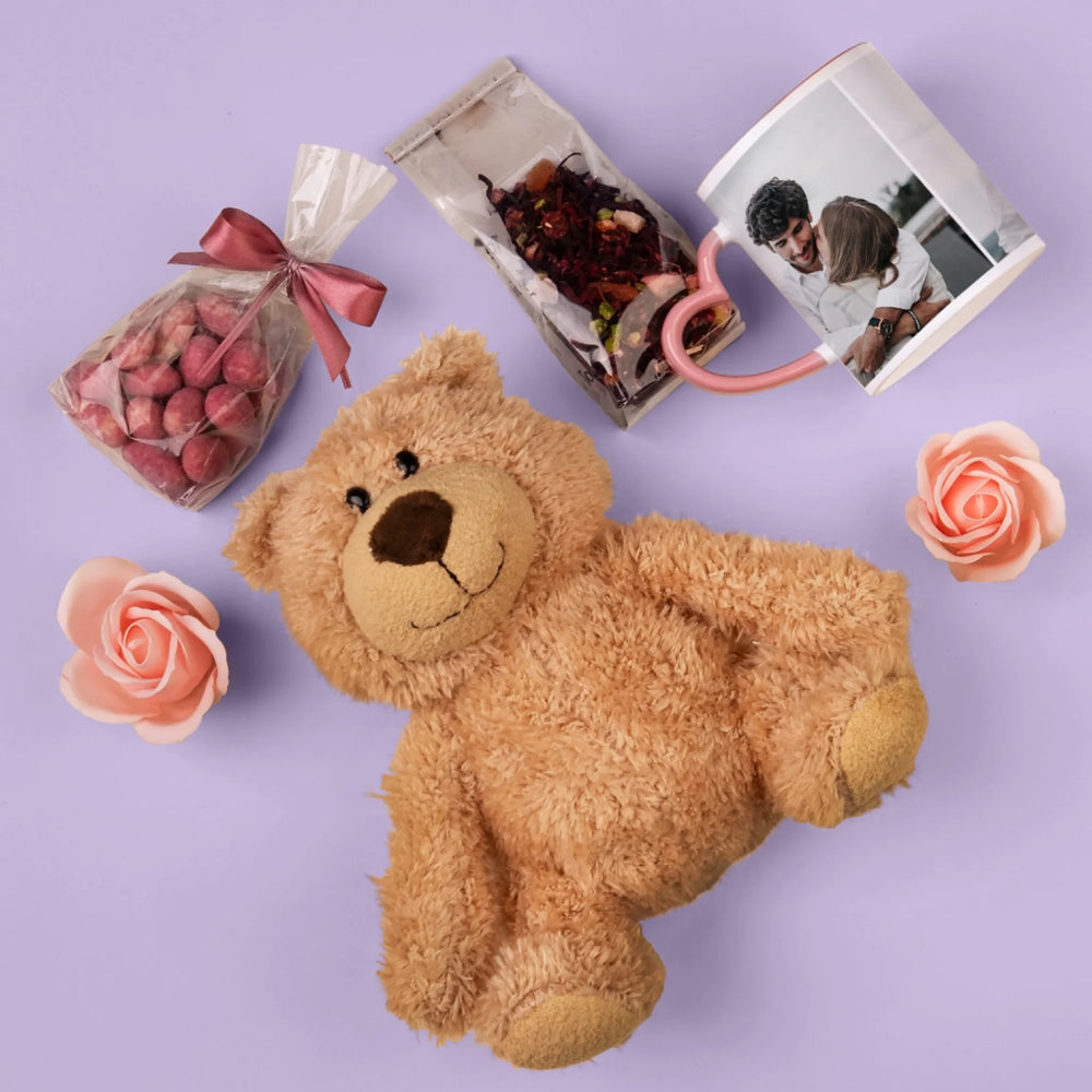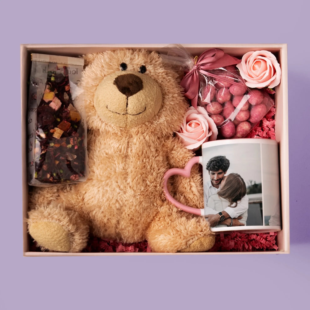• W zestawie znajdują się migdały w czekoladzie, herbata owocowa, róże mydlane oraz pluszowy miś.