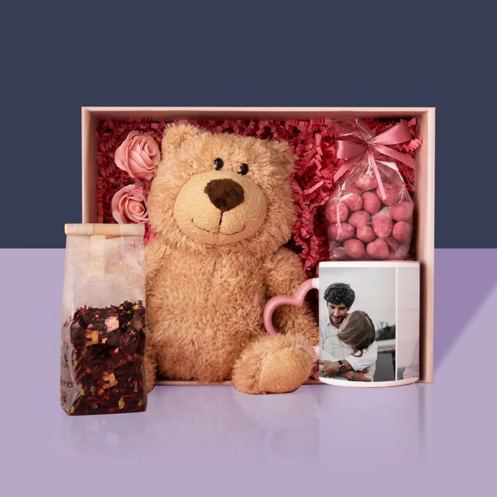 • Piękny zestaw prezentowy z kubkiem z wybraną przez Ciebie personalizacją oraz uroczym misiem i słodkościami.