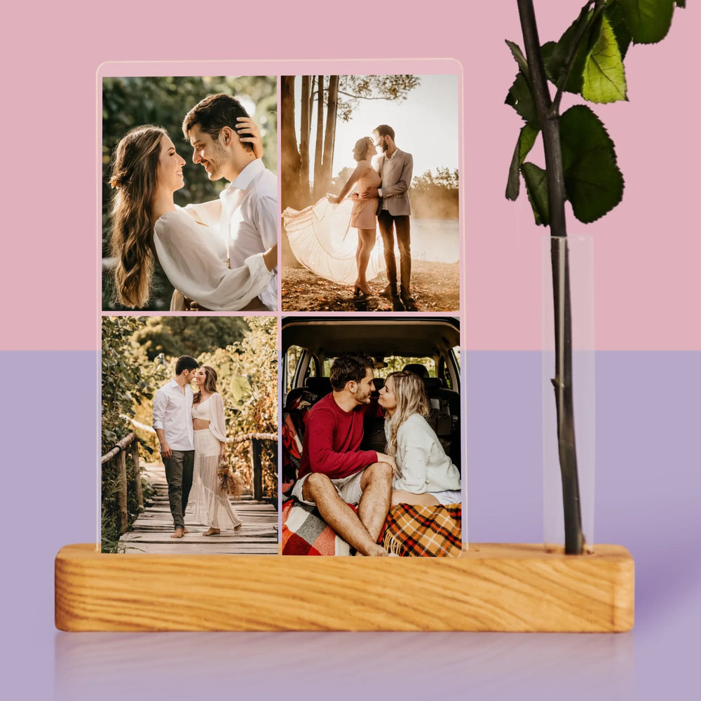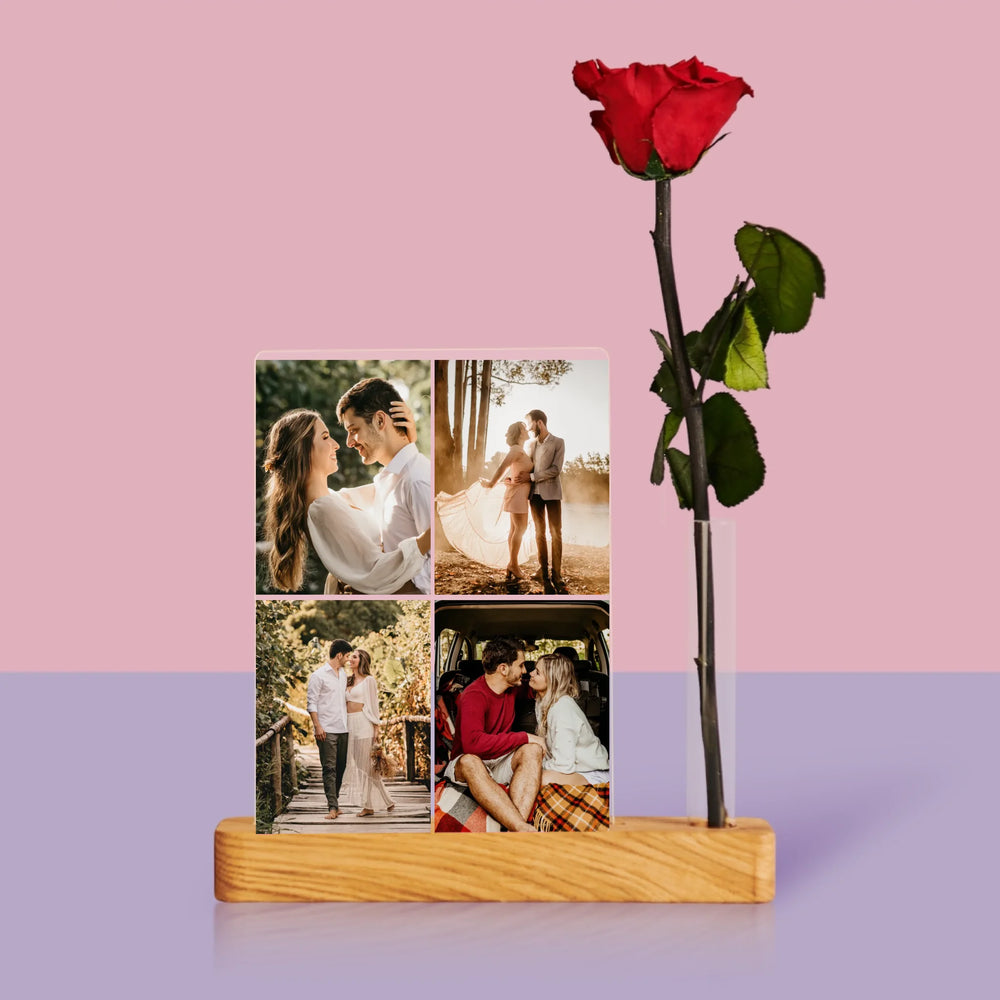 Dołączona róża w małym wazonie w kształcie probówki, umieszczonym w podstawce razem z wydrukiem na szkle akrylowym.
