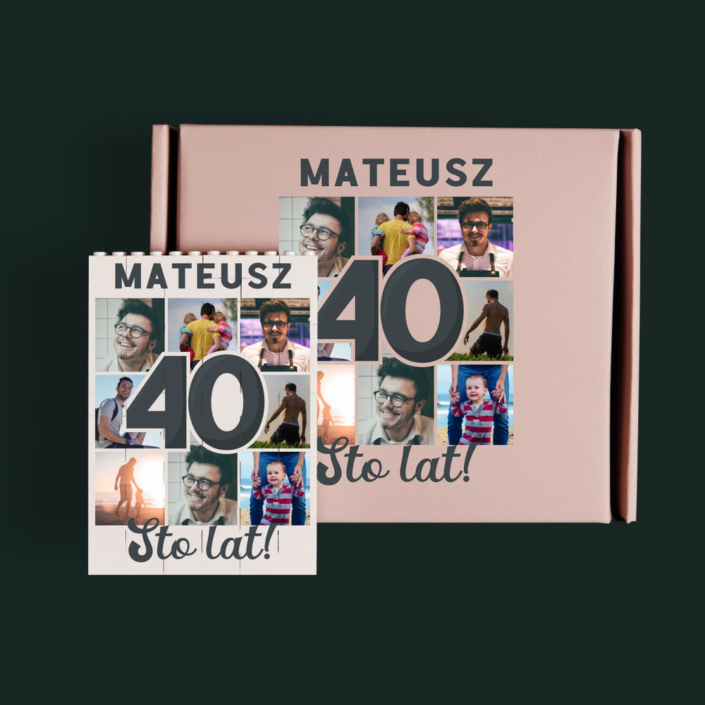 Personalizowany nadruk na klockach oraz na beżowym pudełku.