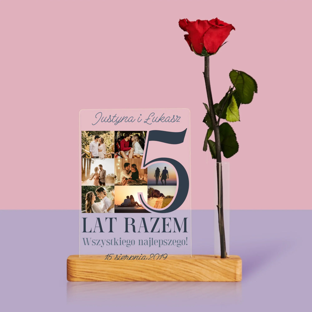 Fotokolaż: 5 Lat Razem - Wydruk na szkle akrylowym z różą