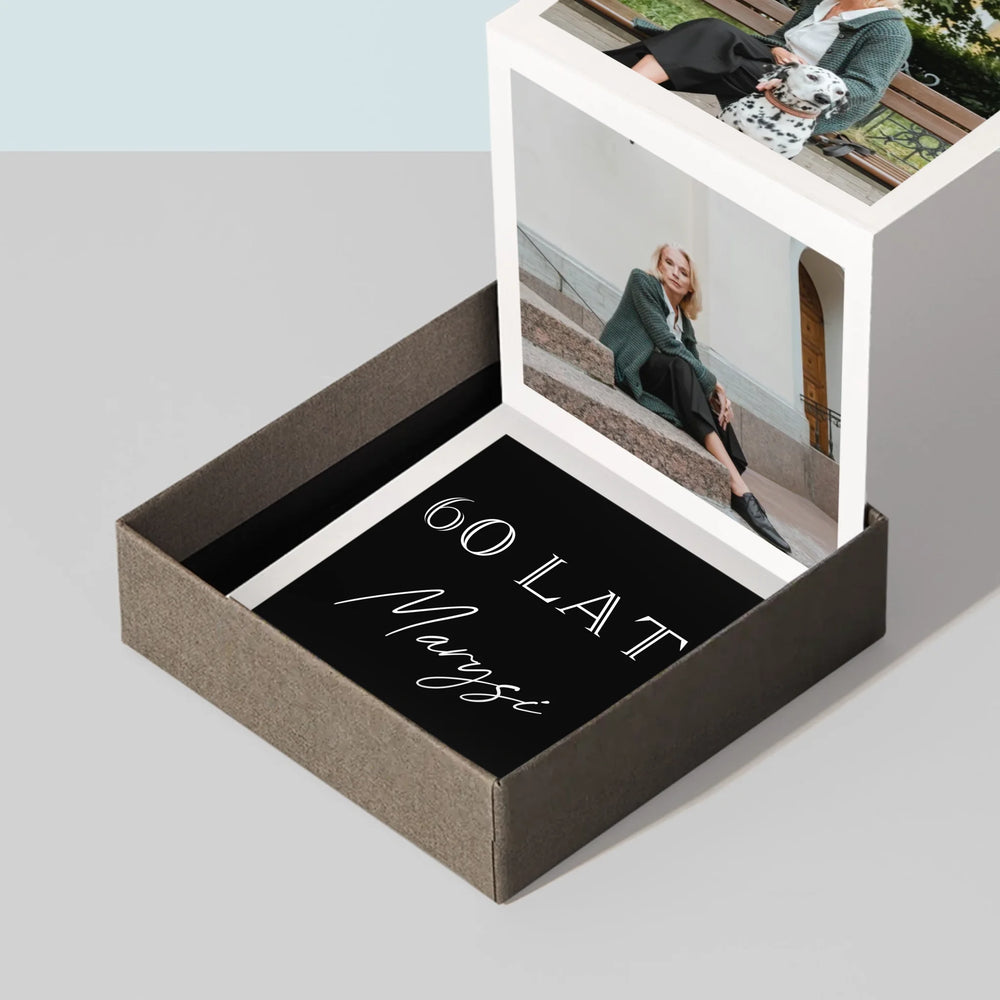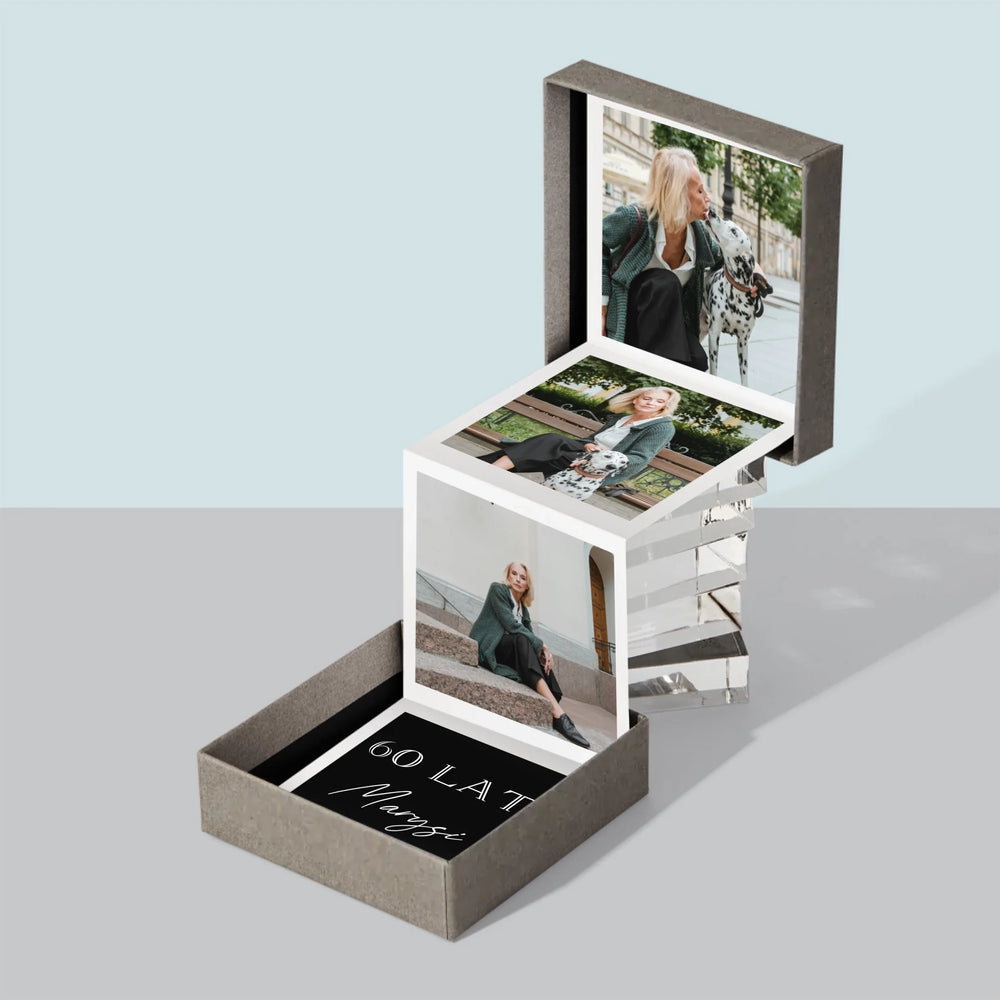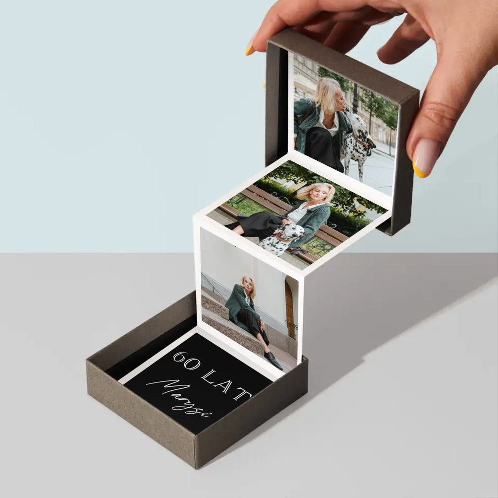 Harmonijka składa się z trzech zdjęć o wymiarach 6,68 x 6,68 cm oraz z personalizowanej karteczki z dedykacją dla obdarowanej osoby