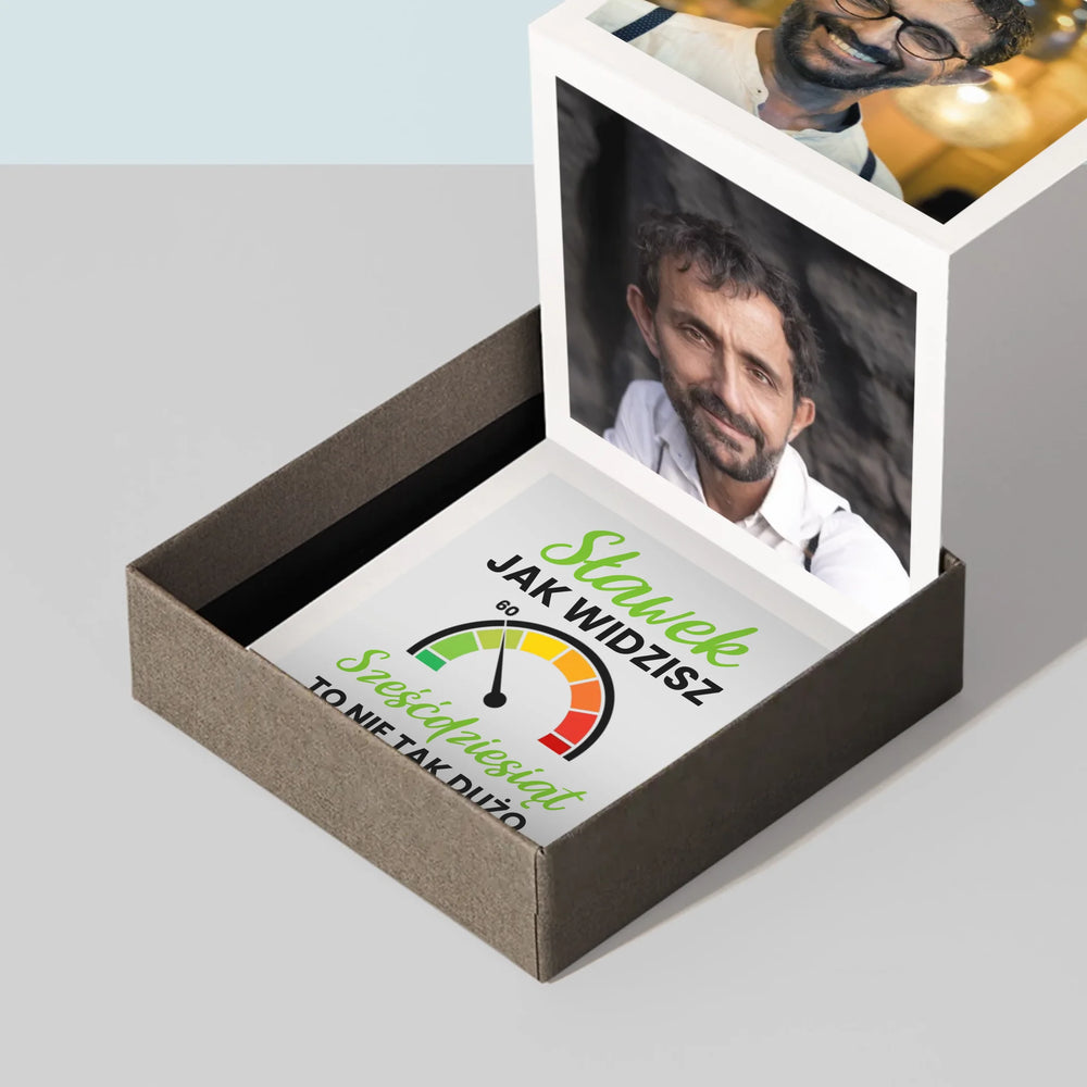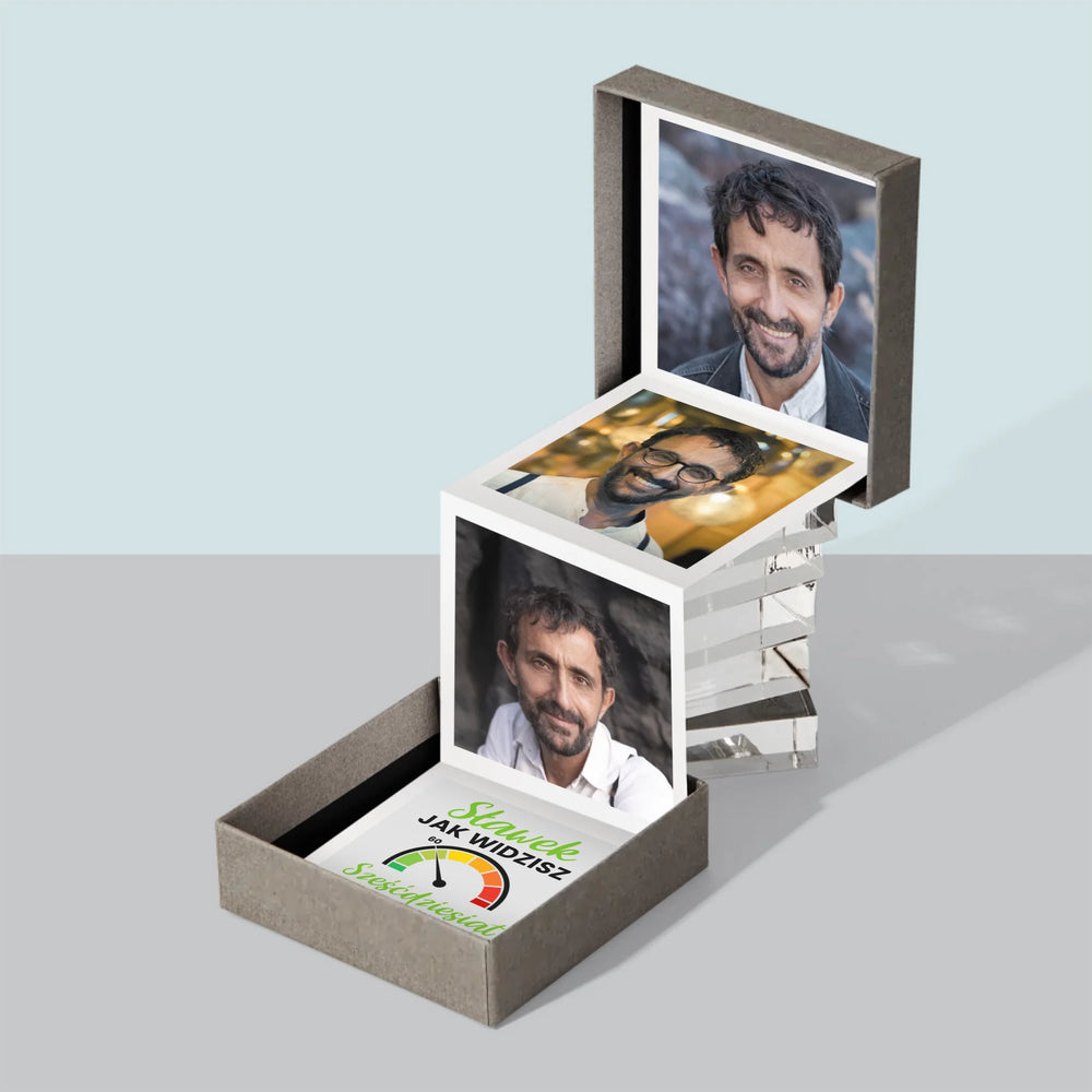 Harmonijka składa się z trzech zdjęć o wymiarach 6,68 x 6,68 cm oraz z personalizowanej karteczki z dedykacją dla obdarowanej osoby