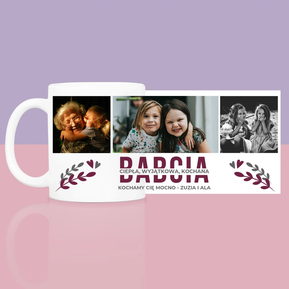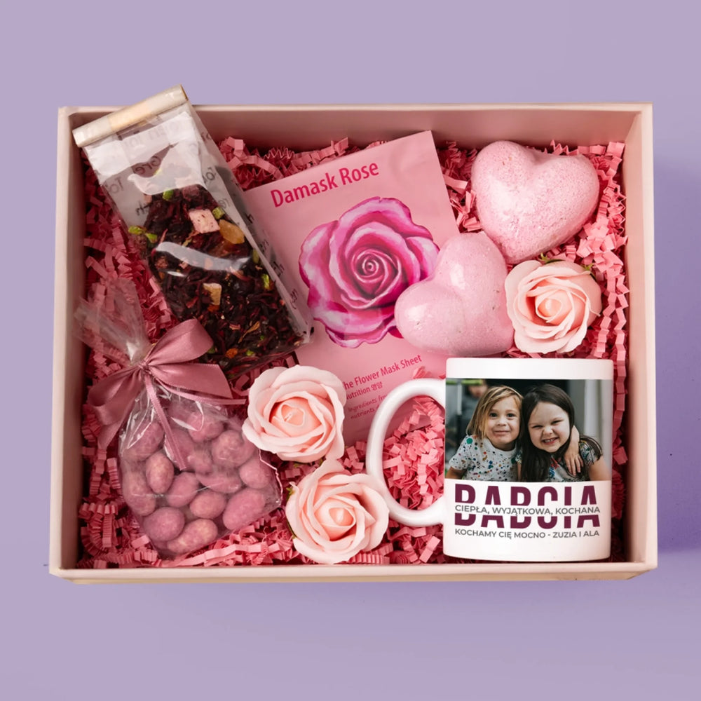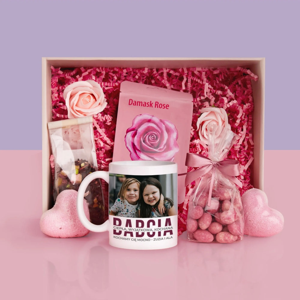 Fotokolaż: Babcia Cechy Charakteru - Zestaw prezentowy z kubkiem i różanym spa