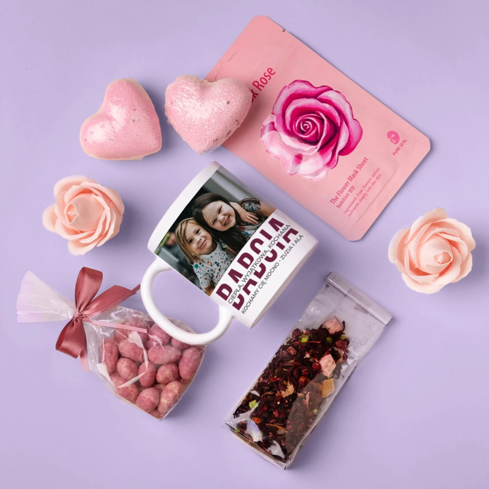 Piękny zestaw prezentowy z kubkiem z wybraną przez Ciebie personalizacją oraz dodatkami niezbędnymi do różanego spa.
