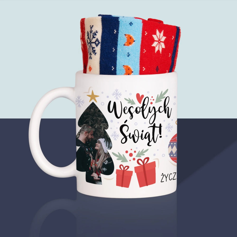 Wysokiej jakości kubek z wybraną przez Ciebie personalizacją ze skarpetkami w środku.