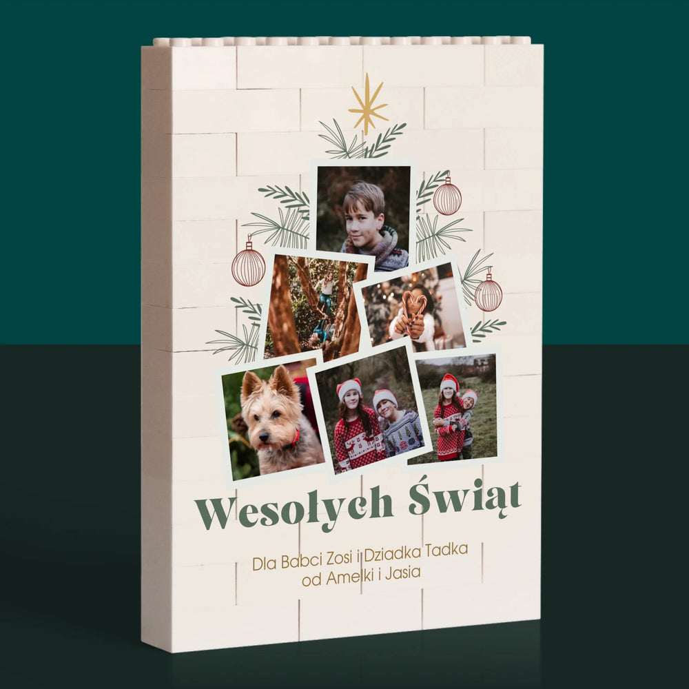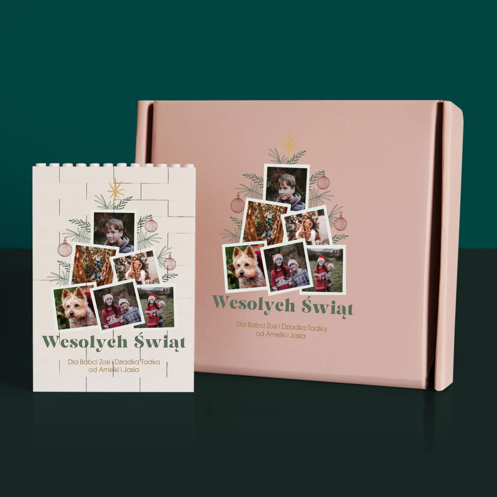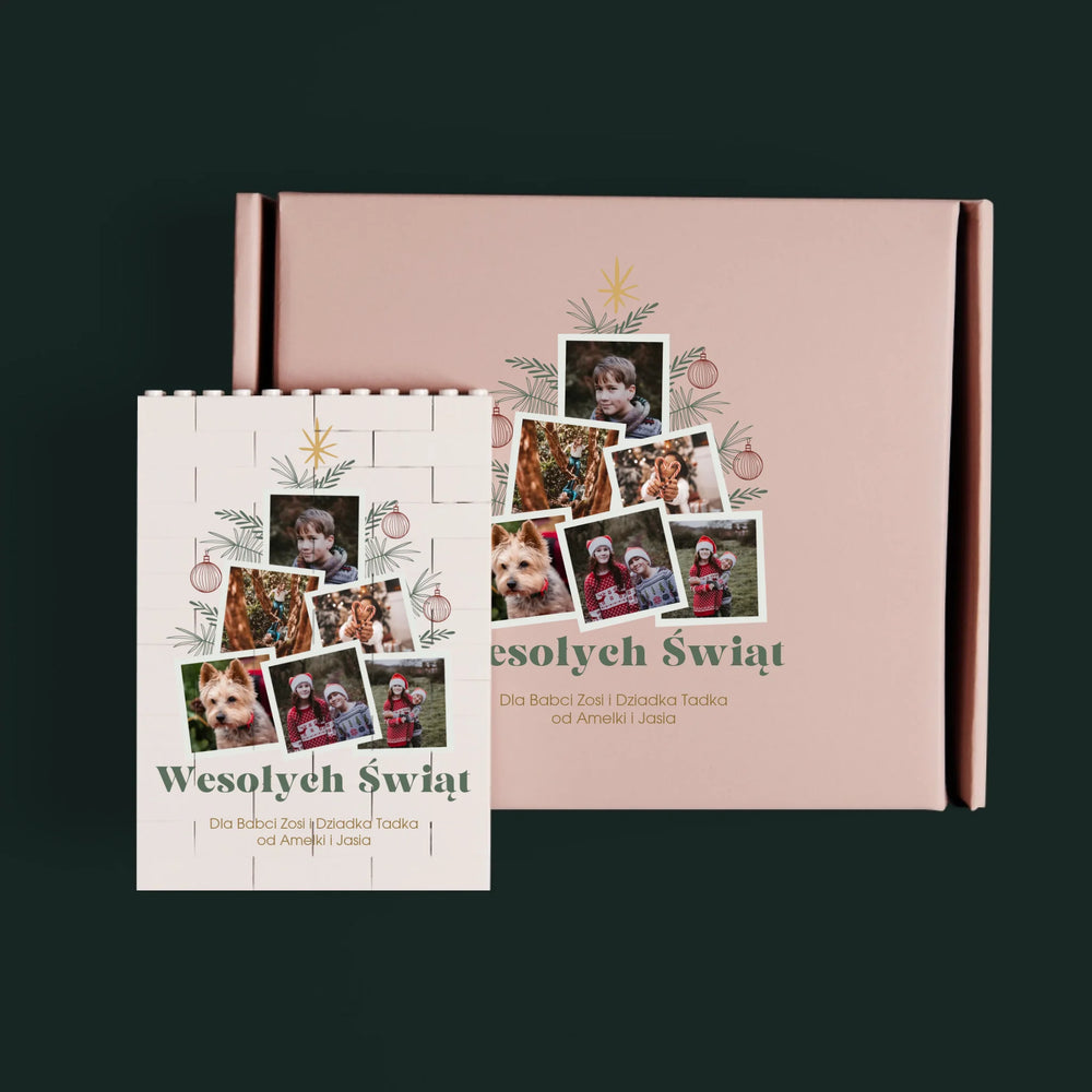Personalizowany nadruk na klockach oraz na beżowym pudełku.