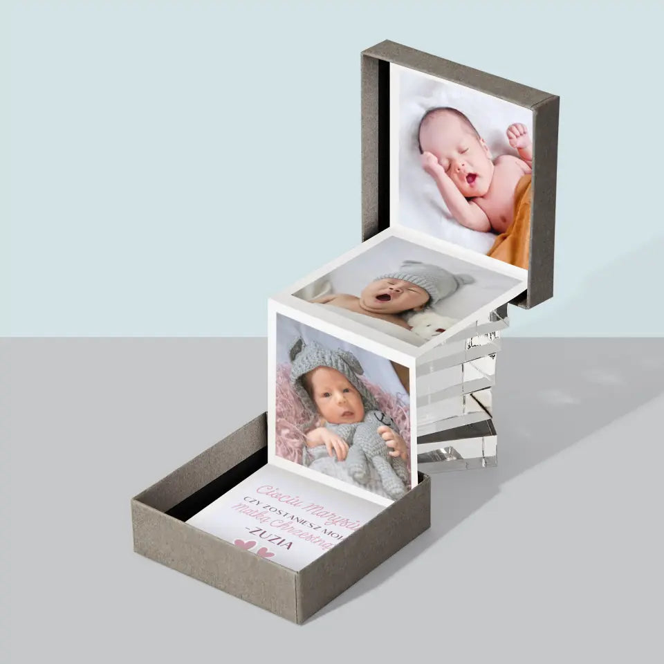 Harmonijka składa się z trzech zdjęć o wymiarach 6,68 x 6,68 cm oraz z personalizowanej karteczki z dedykacją dla obdarowanej osoby