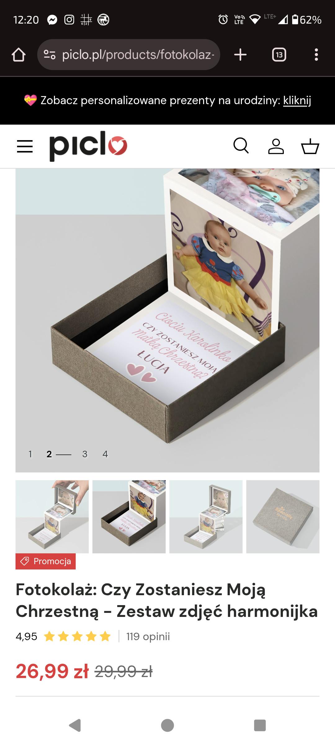 Harmonijka składa się z trzech zdjęć o wymiarach 6,68 x 6,68 cm oraz z personalizowanej karteczki z dedykacją dla obdarowanej osoby