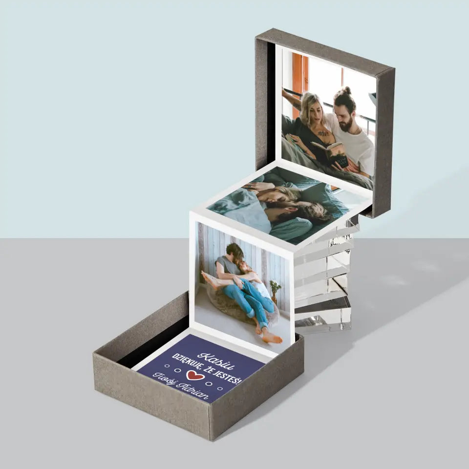 Harmonijka składa się z trzech zdjęć o wymiarach 6,68 x 6,68 cm oraz z personalizowanej karteczki z dedykacją dla obdarowanej osoby