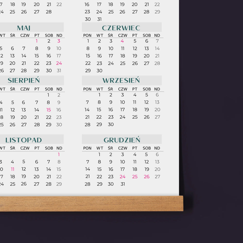 Cały rok umieszczony na jednej stronie, dzięki czemu od razu widoczny jest układ wszystkich miesięcy.