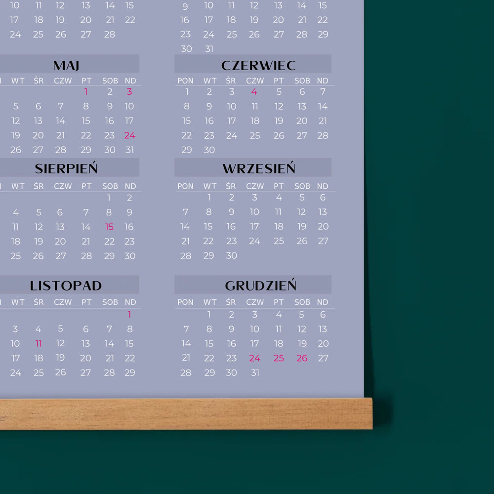 Cały rok umieszczony na jednej stronie, dzięki czemu od razu widoczny jest układ wszystkich miesięcy.