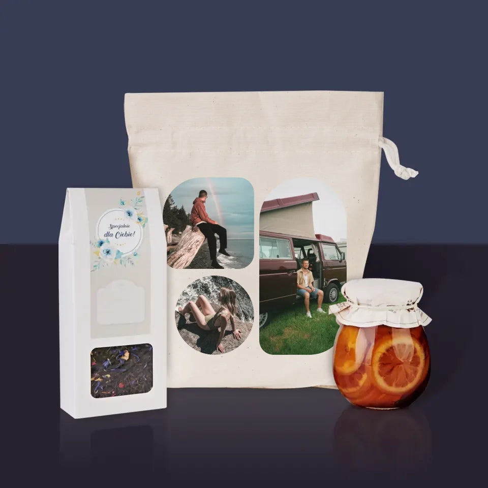 Wybrana przez Ciebie personalizacja wykonana jest na woreczku, w którym znajduje się w środku opakowanie herbaty oraz słoik z cytrynkami z cynamonem.