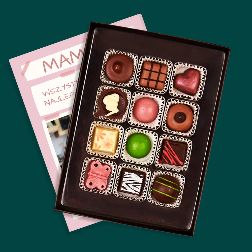 Pyszne praliny z belgijskiej czekolady w eleganckim pudełku z wybraną przez Ciebie personalizacją.