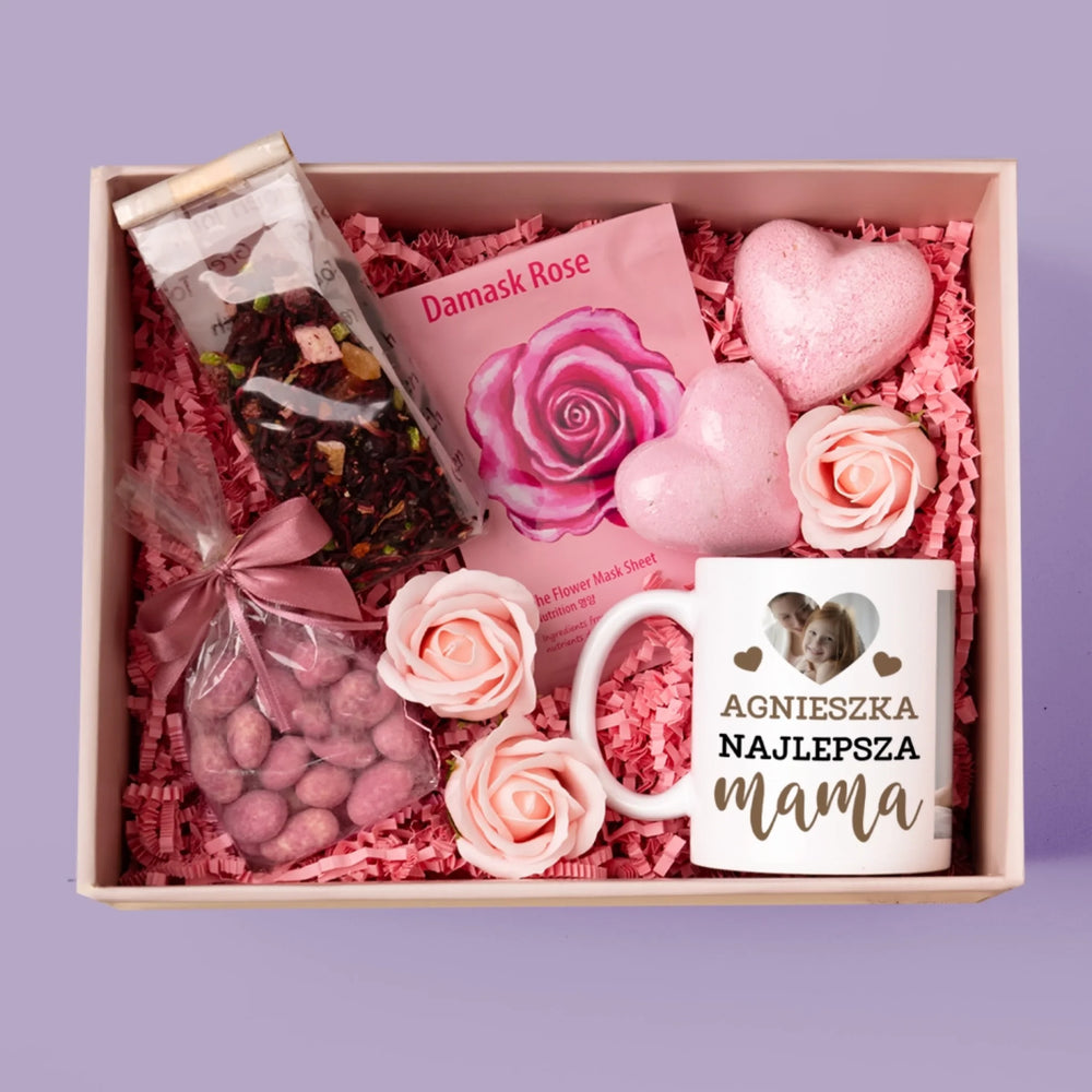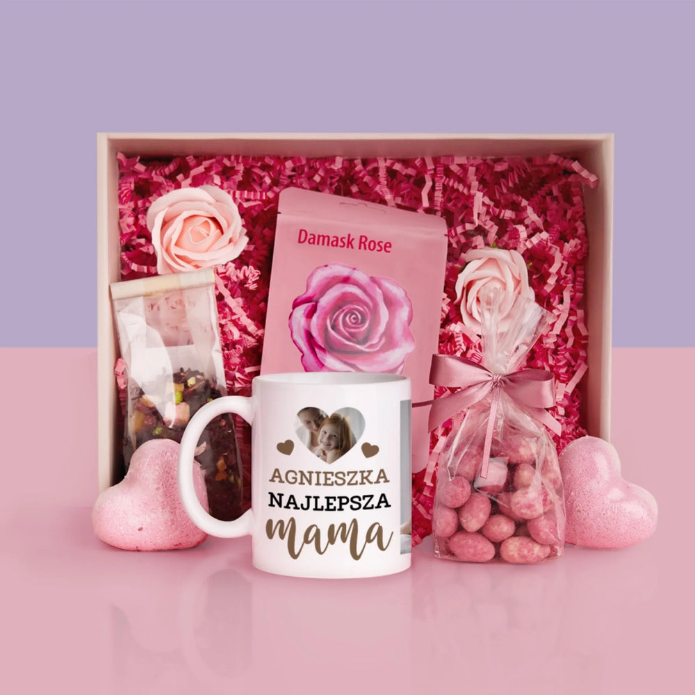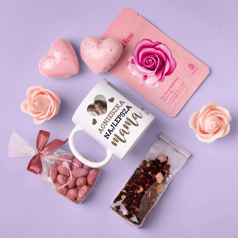 Fotokolaż: Najlepsza Mama Serce - Zestaw prezentowy z kubkiem i różanym spa