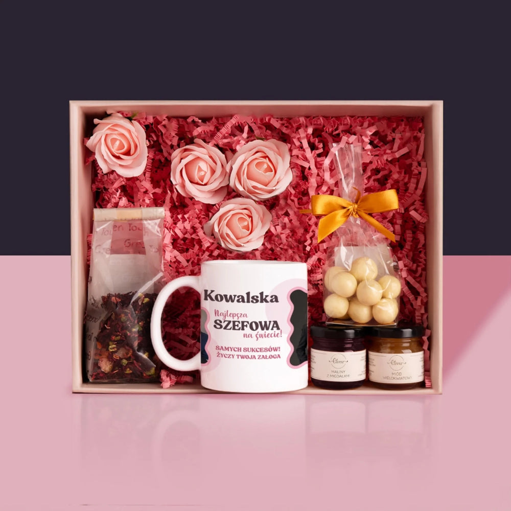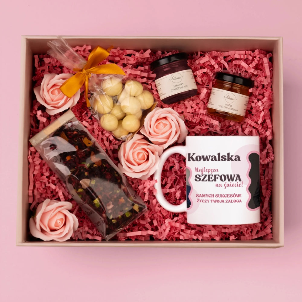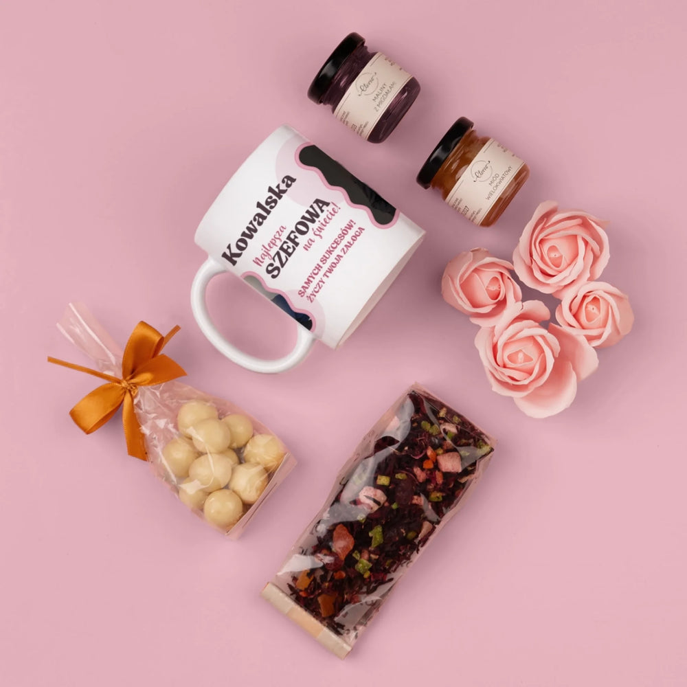Piękny zestaw prezentowy z kubkiem z wybraną przez Ciebie personalizacją oraz dodatkami - herbatą i słodkościami.
