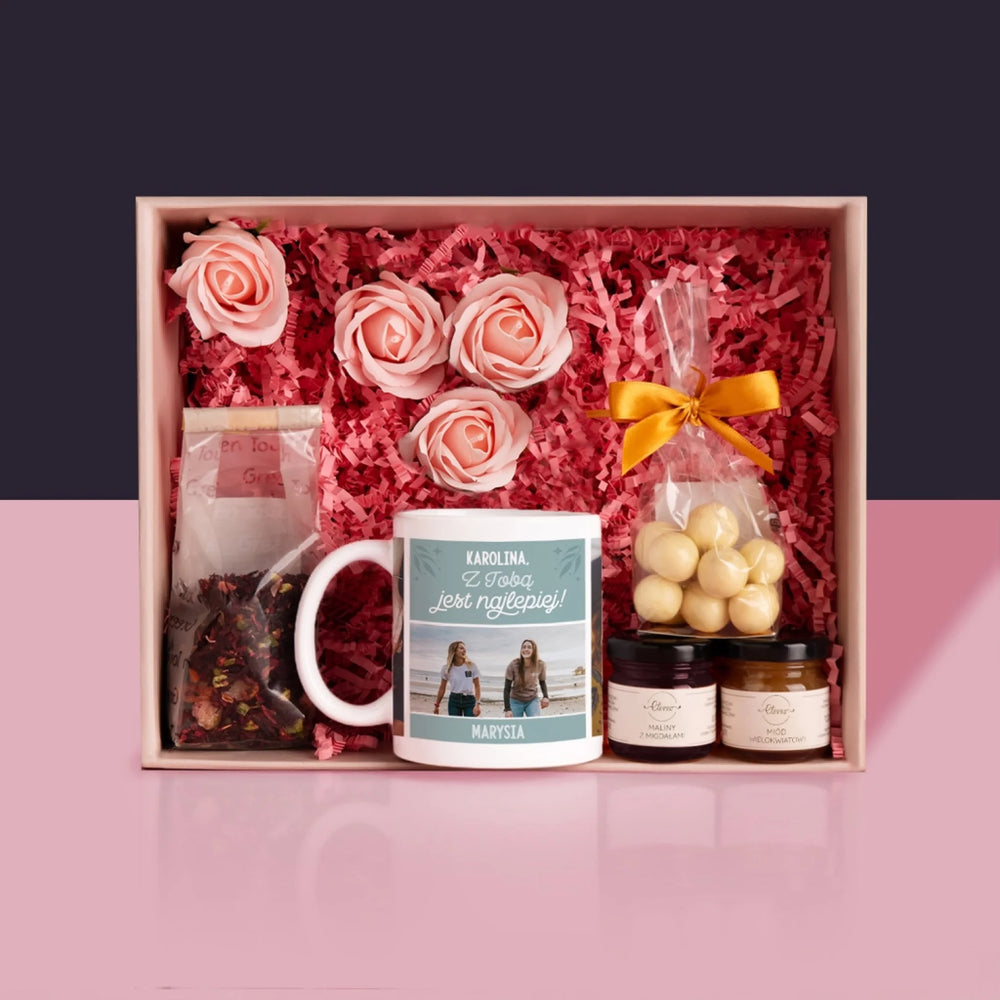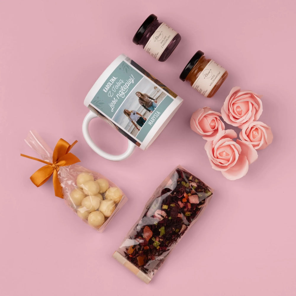 Fotokolaż: Najlepsze Przyjaciółki - Zestaw prezentowy z kubkiem, herbatą i słodkościami