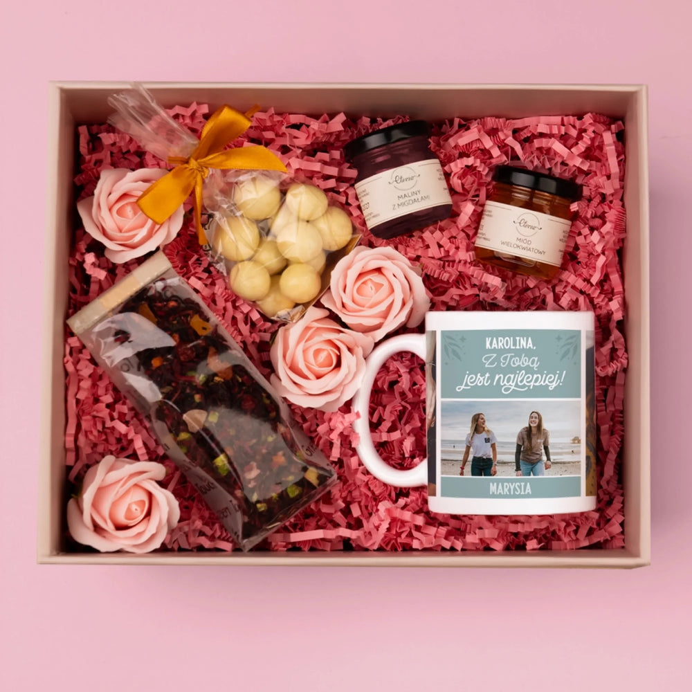 Piękny zestaw prezentowy z kubkiem z wybraną przez Ciebie personalizacją oraz dodatkami - herbatą i słodkościami.