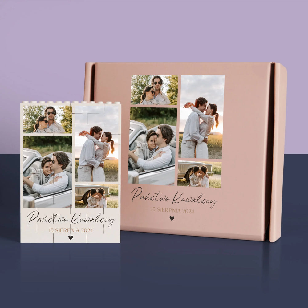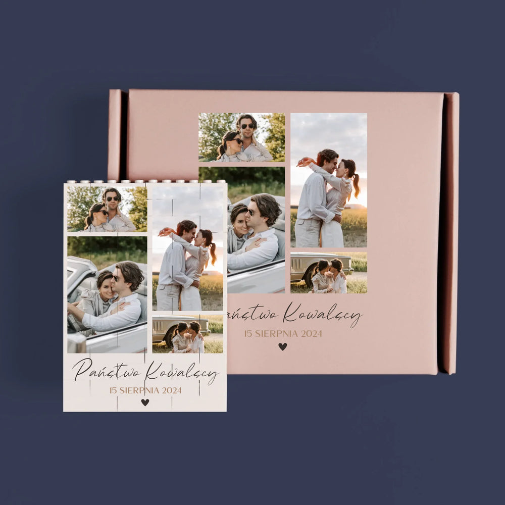 Personalizowany nadruk na klockach oraz na beżowym pudełku.