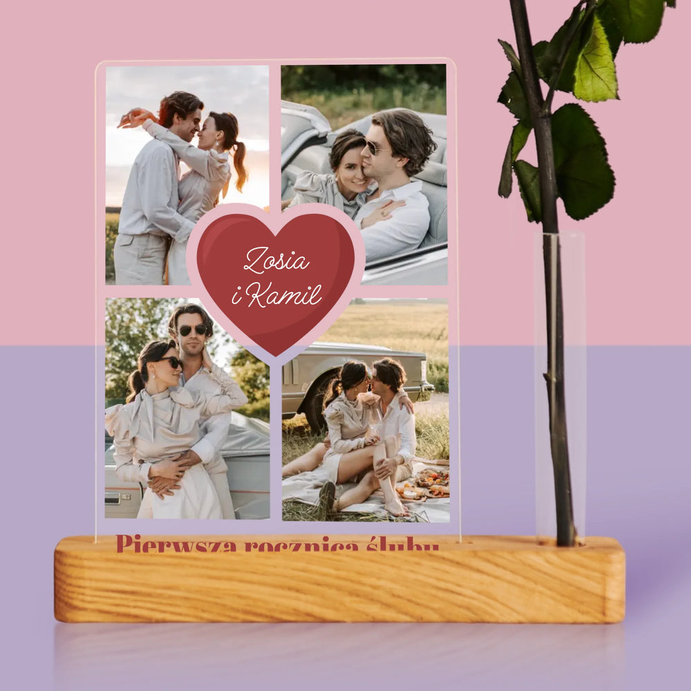 Fotokolaż: Pierwsza Rocznica Serce - Wydruk na szkle akrylowym z różą