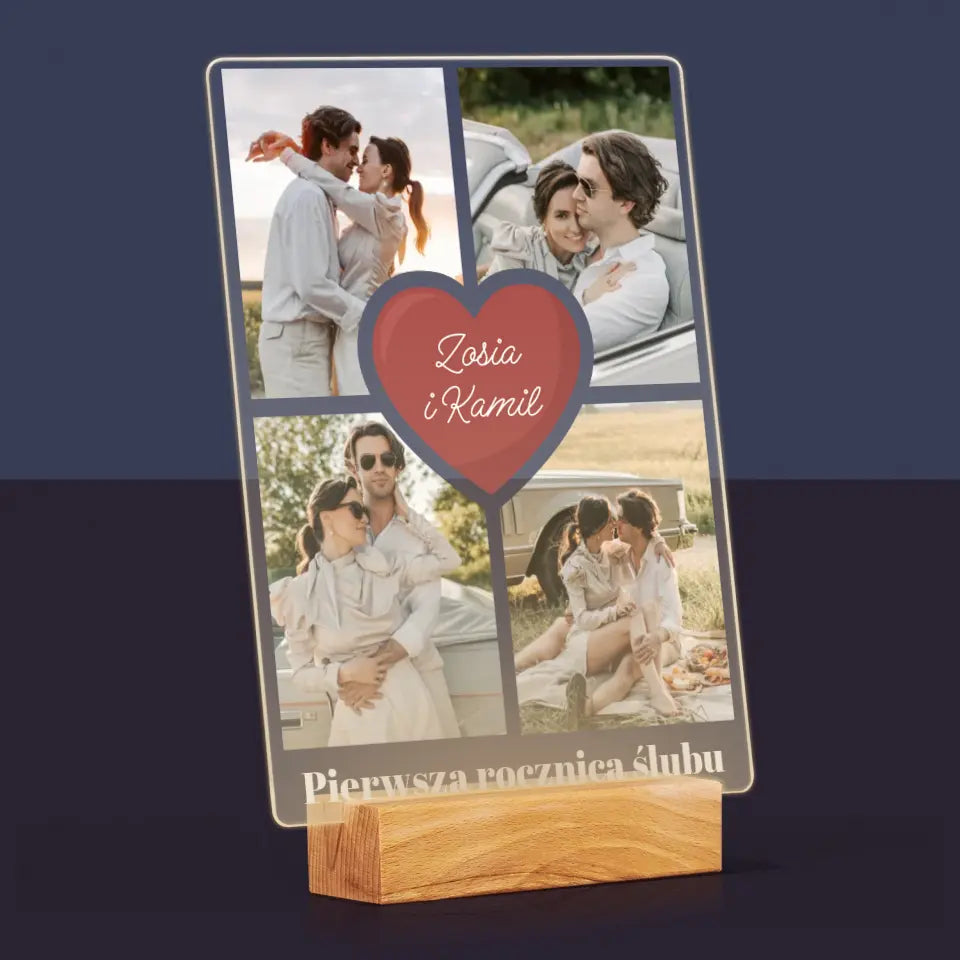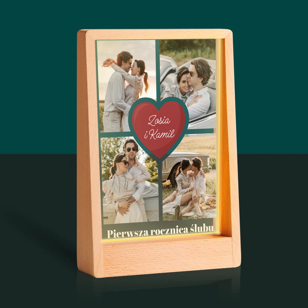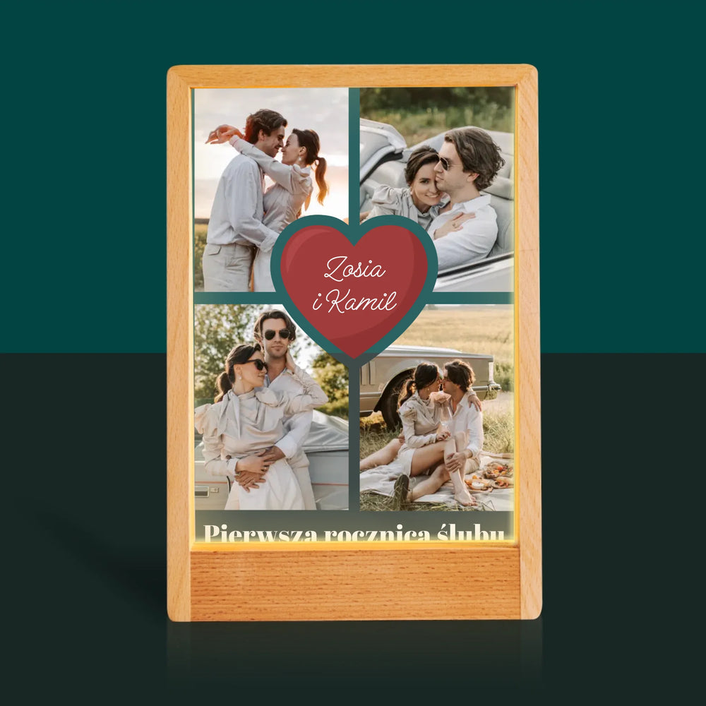 Fotokolaż: Pierwsza Rocznica Serce - Wydruk na szkle akrylowym w ramce LED