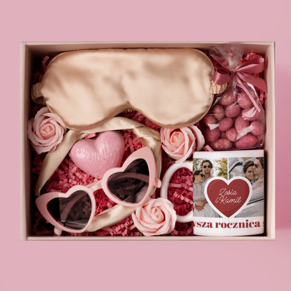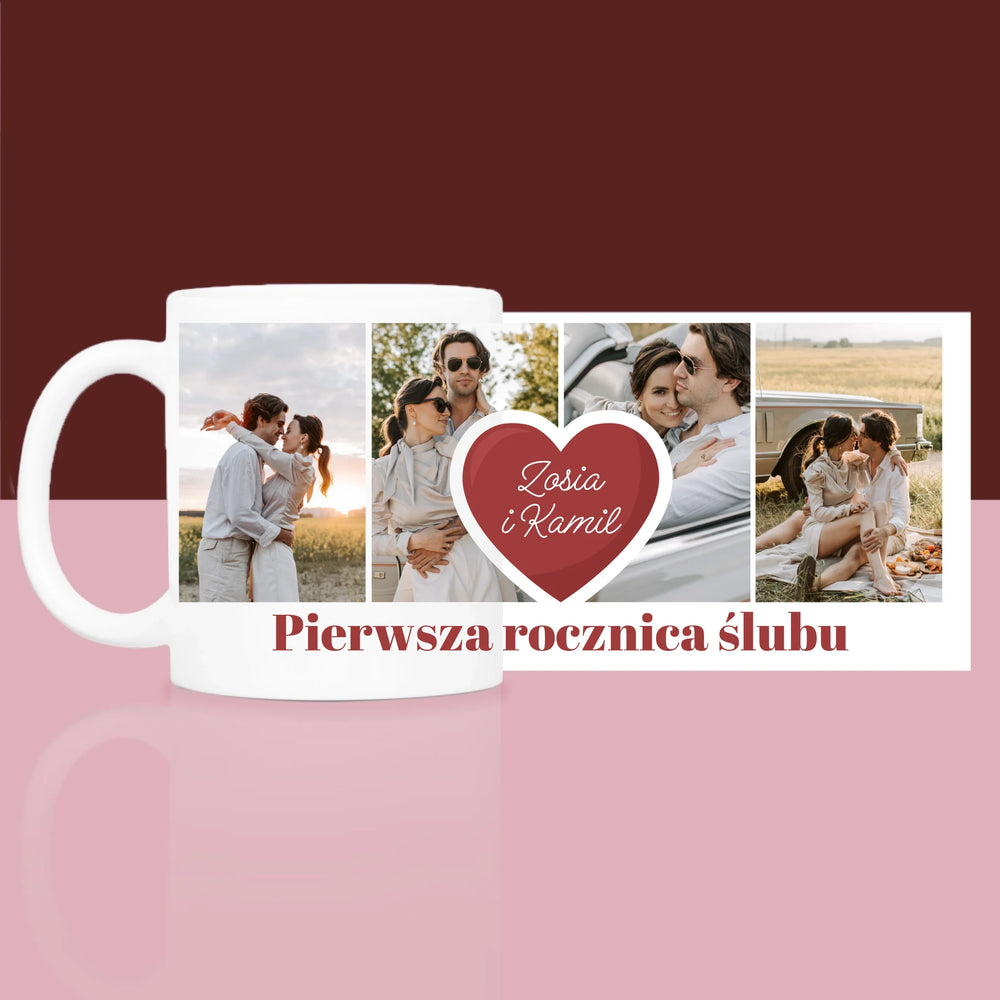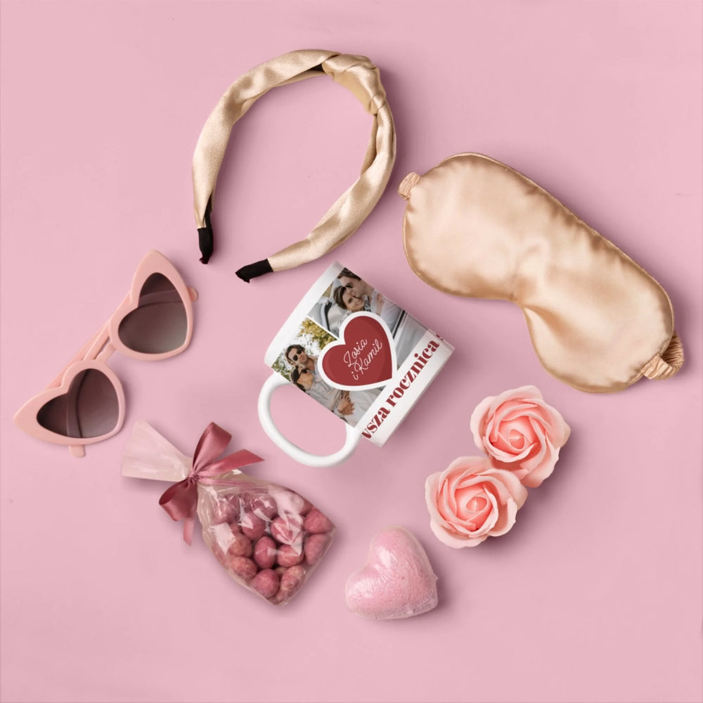 Fotokolaż: Pierwsza Rocznica Serce - Zestaw prezentowy z kubkiem i satynową opaską