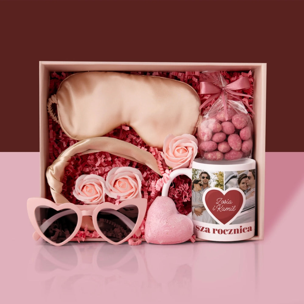 W zestawie znajdują się migdały w czekoladzie, kula do kąpieli w kształcie serca, opaska na oczy, okulary w kształcie serca oraz róże mydlane.