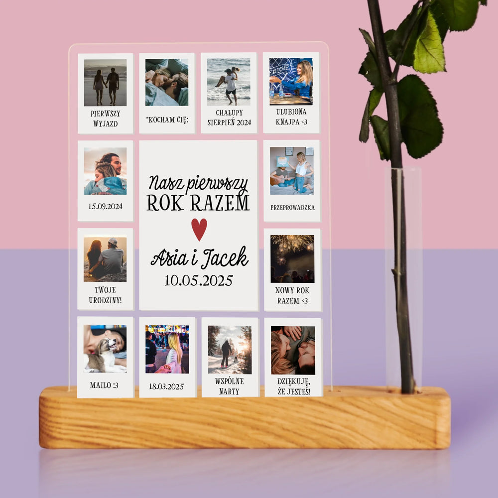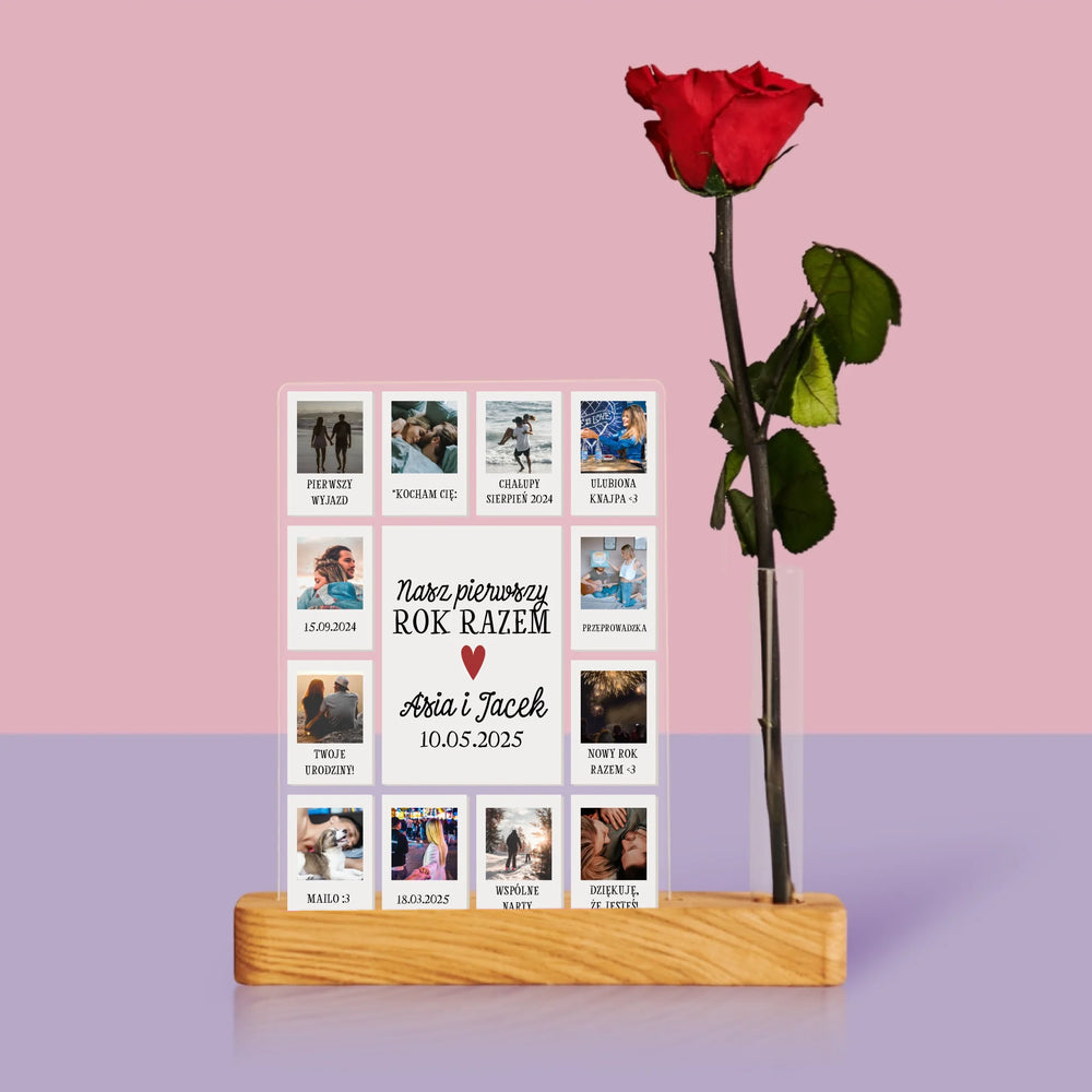 Dołączona róża w małym wazonie w kształcie probówki, umieszczonym w podstawce razem z wydrukiem na szkle akrylowym.