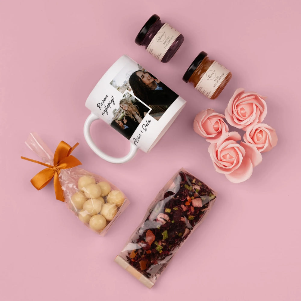 Piękny zestaw prezentowy z kubkiem z wybraną przez Ciebie personalizacją oraz dodatkami - herbatą i słodkościami.