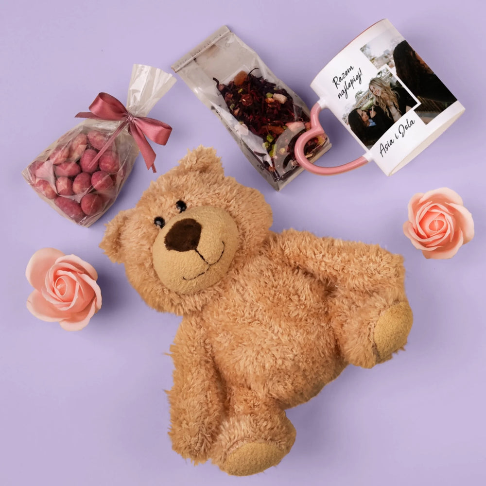Piękny zestaw prezentowy z kubkiem z wybraną przez Ciebie personalizacją oraz uroczym misiem i słodkościami.