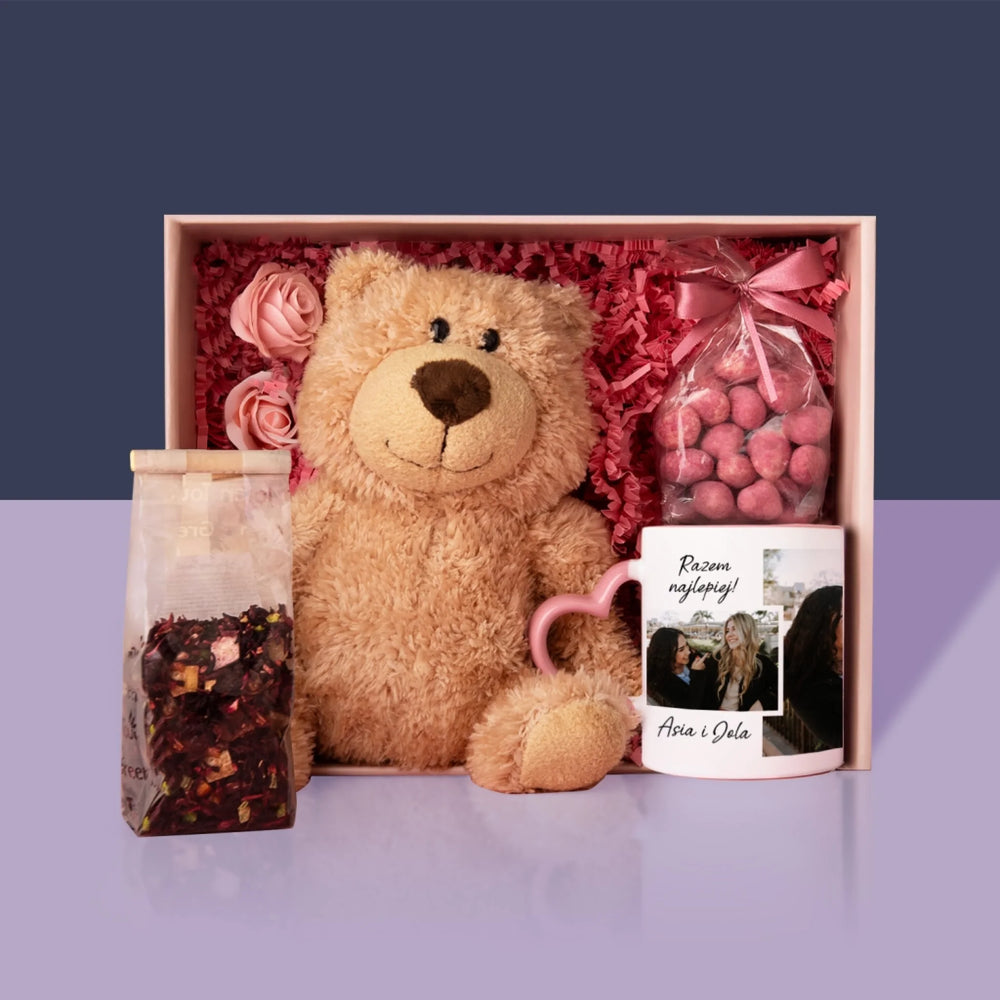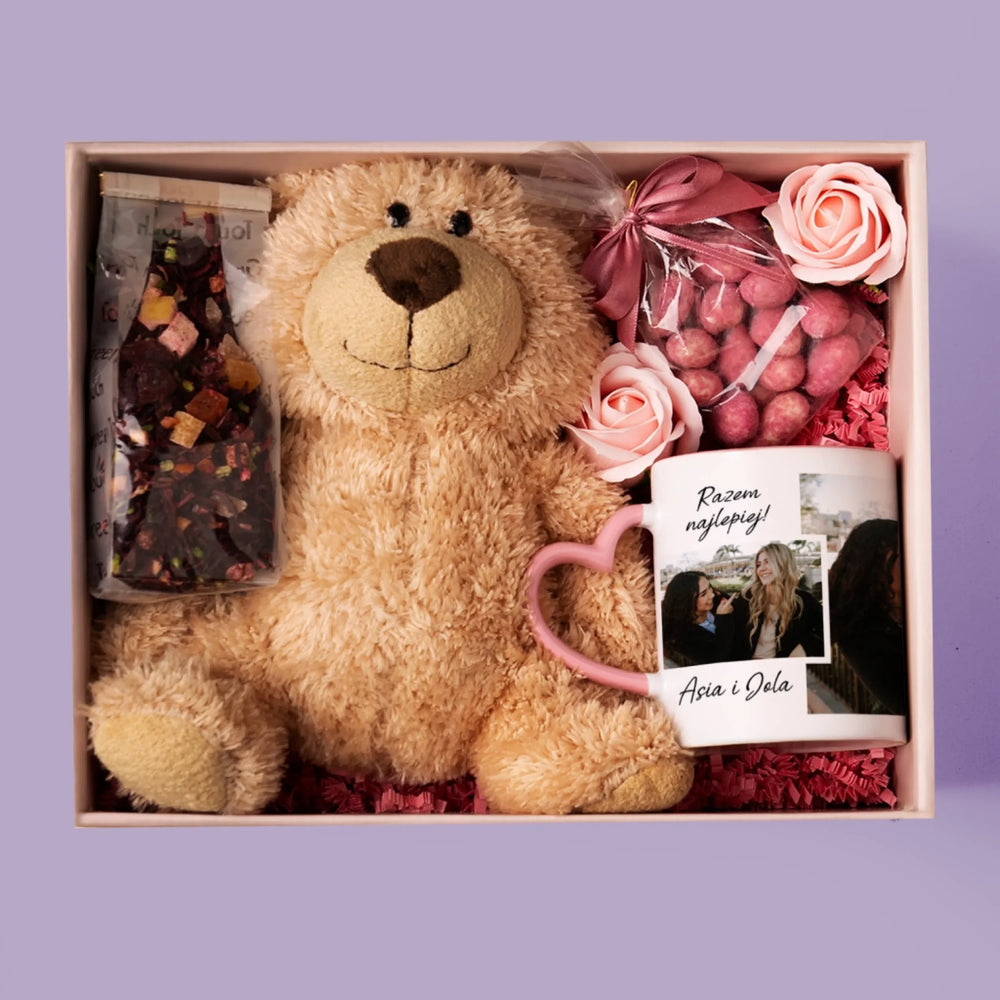 Fotokolaż: Przyjaciółki Razem Najlepiej - Zestaw prezentowy z kubkiem, misiem i słodkościami
