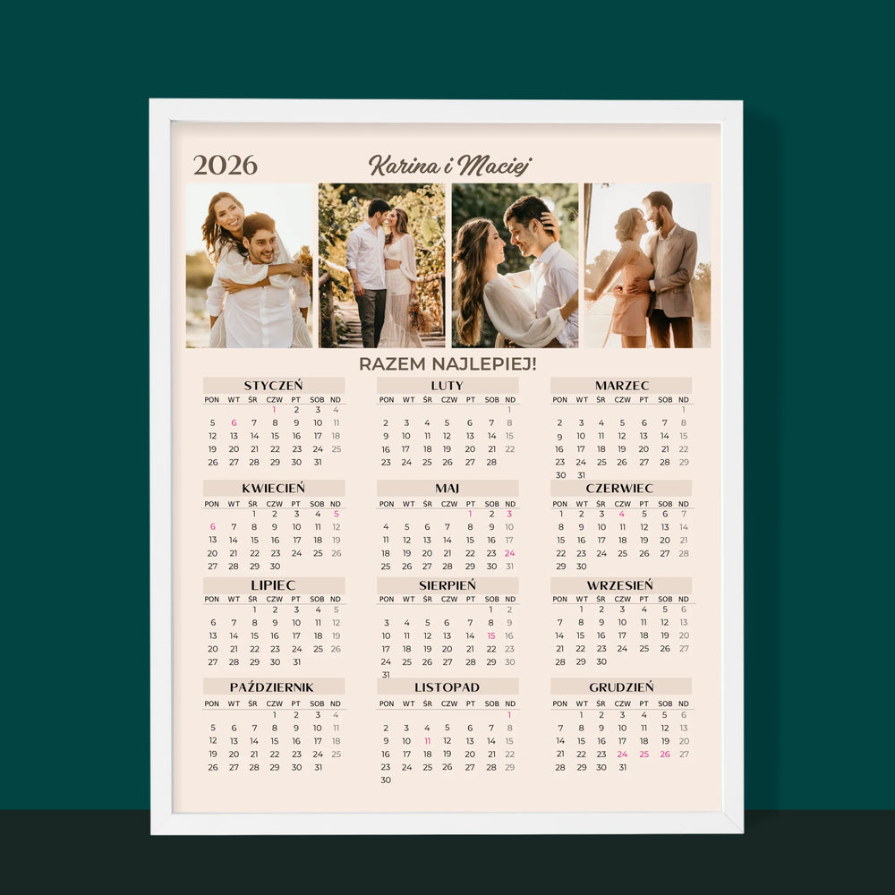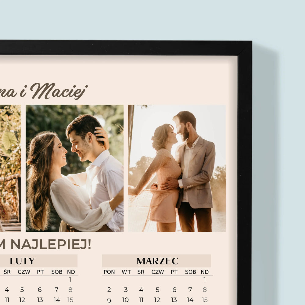 Fotokalendarz oprawiony w ramkę z wybranymi przez Ciebie zdjęciami.
