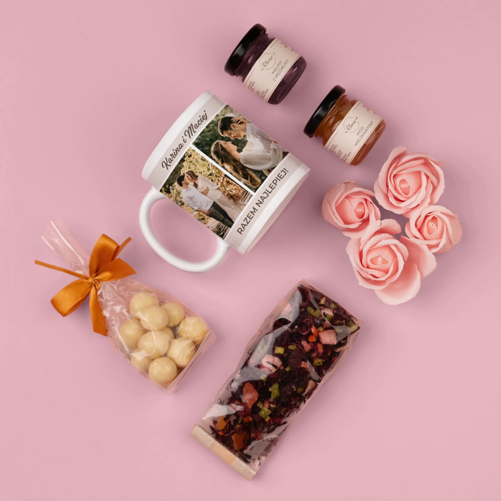 Piękny zestaw prezentowy z kubkiem z wybraną przez Ciebie personalizacją oraz dodatkami - herbatą i słodkościami.