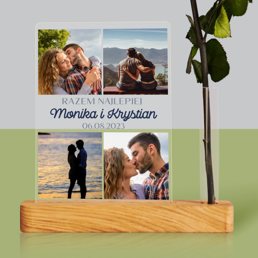 Dołączona róża w małym wazonie w kształcie probówki, umieszczonym w podstawce razem z wydrukiem na szkle akrylowym.