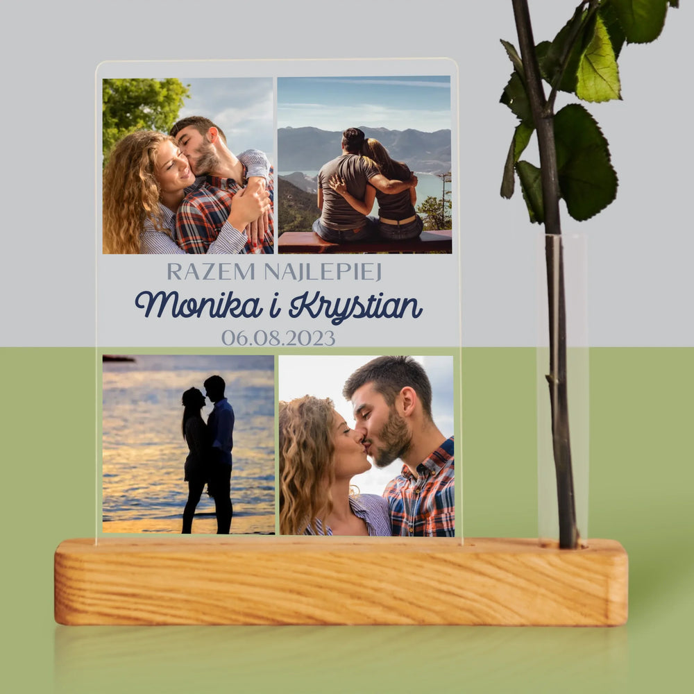 • Dołączona róża w małym wazonie w kształcie probówki, umieszczonym w podstawce razem z wydrukiem na szkle akrylowym.